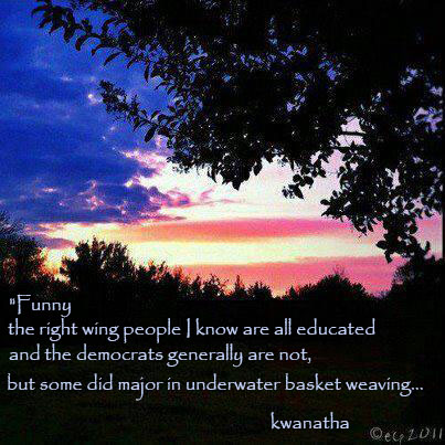 Location: I can see the end of the world from here! | kwanatha - 2016-01-28 7:27 AM funny the right wing people I know are all educated and the democrats generally are not, but some did major in underwater basket weaving...