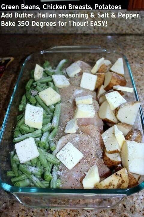 Location: Kansas | BamaCanChaser - 2014-01-10 3:37 PM brlracerchick - 2014-01-10 3:27 PM There is one that I learned from Pinterest where you just have 2 chicken breasts, a can of green beans and a few potatoes. You put them all next to each other in a pan, put some butter on potatoes and green beans, then put dry italian seasoning over all of it. Stick it in the oven for like an hour (can't remember exact time off the top of my head), then it's done! Very easy and very good!