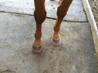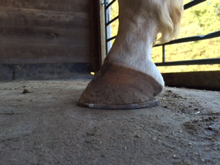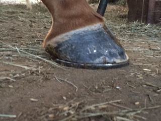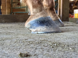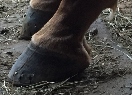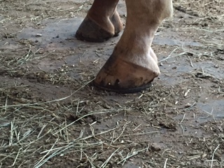 ETA: The back hoof had an abcess blow out and that is where it has grown down to, so that is why there is a chunk of hoof missing.
