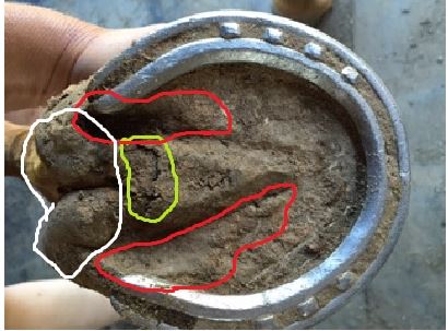 Now the white circle is to show definitely contracted heals. You can see the heel bulbs look very squished together. Also notice how the farrier shoed fairly crooked. You can see a good amount of heel in the open on one side vs the other.
