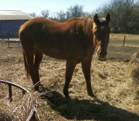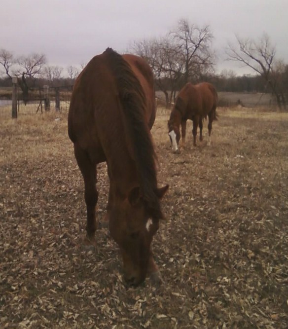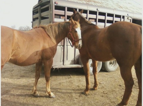 Location: Kansas | Yesterday, Tuffy and I road-tripped it to Oklahoma and picked up "Royal Red Streaker," a 12 year old appendix gelding who ran on the track and then ended up in pretty bad shape before he wound up with one of our BBs. I decided that turning a new horse out with 5 others would be a bad idea so I took Clifford out to my brother & sister-in-law's place and turned him out in their pasture so Streak would have a buddy right off. Cliff and Streak became buddies right off and they met me at the gate this morning when I went out to feed. I gave them time to eat, then went back out with halters and before I could latch the gate behind me, there was a 16 hand bright sorrel gelding standing behind me. :) I wound up saddling them both up with the wind howling, then got on Streak for just a couple minutes. Didn't do much besides turn and walk a few steps then walk to the other side of Cliff, but I hate to do much with a new horse when the wind is so crazy, so I got on Cliff and ponied Streak around their yard and barns for a few minutes before I couldn't stand the wind anymore.