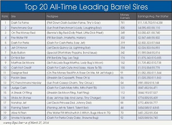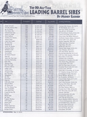 If you look at this chart which tells a truer story than percentage of foals ... you will see a lot of only barrel sires in the high dollar earning list ... pay attention to the avg earnings of each sire and you will have better data ...