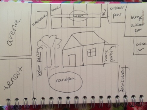 Location: Phoenix | Here is what my barn owner has. House/yard in the middle (fenced in backyard), top right corner are 3 larger outdoor pens. Back of the property has a feed room, and then a covered barn with a tack room and wash rack on the outside. Left side has the arena, and then a turnout. Next to the turnout is the roundpen. In front of the house (next to roundpen) are foliage/plants. Directly in front of the roundpen is a tree with trailer parking. For the small acreage--it works.