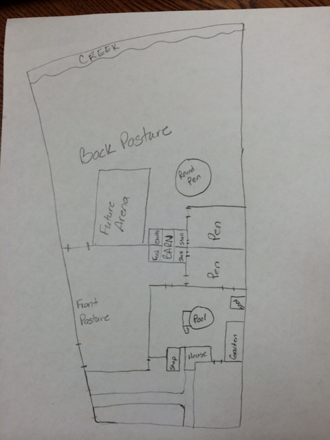 My place is a perfect rectangle with the short side being against the road. Looking at my place from the road you have small front yard, house, small back yard, small Lot with a 10x20 lean to, middle lot that is turned into an arena with a round pen in the corner and back lot that is "pasture" with a lean to (will soon be a shed row to use as "stalls." I have a lane that starts with the driveway that runs down the side of my house, back yard and pen with the 10x20 that stops at the arena so I have driving access to every pen/lot.