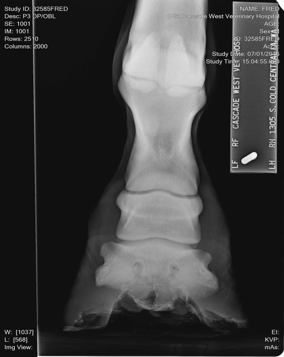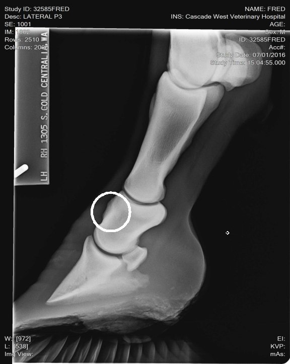 I am his farrier. He did not have a proper trim prior to the X rays. He had a bunch of false sole I didn't not want to take out and risk him coming up sore for potential buyers. ha ha ha He has since been trimmed, sole taken out and he has correct angle. Cant remember is I mentioned in original post if he ran throught he fence and had a month off to recover, so when we turned him out I trimmed him up as there was no concern of him being sore.