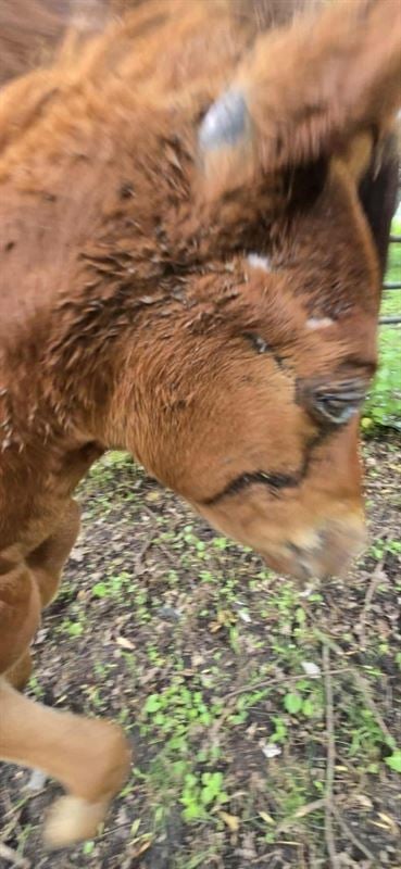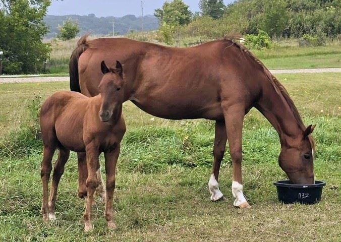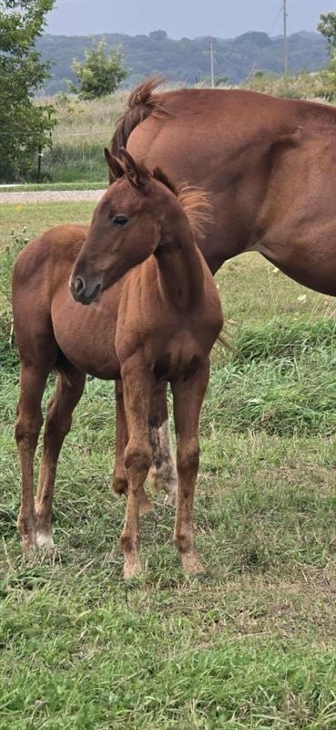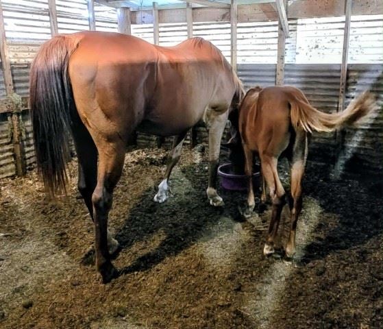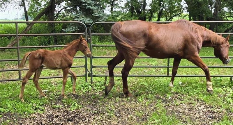 I haven't been on here in quite a while but just had to share my sale barn find.  I actually went to the sale barn to their weekly hay sale to buy small squares of grass hay and came home with a mare and filly instead.  My husband was super excited (insert sarcasm font here).  The first 3 pics were taken June 25th, the day I brought them home.  Baby was born May 18th.  The last 3 pics were taken about a week ago.  The filly had an injured eye that I wasn't sure we were going to be able to save and both were very thin.  Momma wasn't milking well, no surprise given how thin she was.  They are both doing great!  Mom has had her teeth done, feet trimmed and both have been wormed.  Lots of grain, grass, and love.  Momma has been very good about letting us doctor the baby and is actually very sweet to be around.  Not sure how they got to be in that condition and it doesn't matter anyway.  I am pretty excited about this filly.  We call her Reba.  Her momma is Quiet Bride and her daddy is Epically Famous.  Not a bad find...